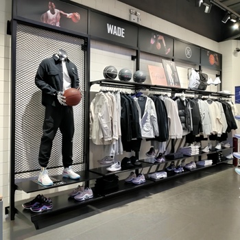 Estantes de exhibición de ropa deportiva y zapatos, estantes de supermercado personalizables de acero inoxidable con vitrinas para tiendas de artículos deportivos