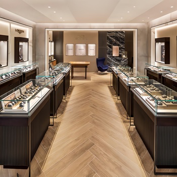 High-End katı ahşap masaüstü camlı vitrin dolabı paslanmaz çelik çevreleyen takı ekran sahne doğrudan fabrika vitrin